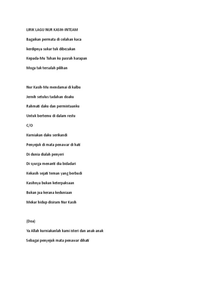Lirik Lagu Nur Kasih / Sifatkan Lirik Lagu Dynamite Untuk Budak Budak Tiz Zaqyah Diserang Army Bts Kalau Tahu Korang Kurang Ajar Macam Ni Tak Malu Ke Sensasi Mstar. Layanan mobile dari situs entertainment terbesar indonesia, kapanlagi.com. Anda ada lagu ost ni x? Putra aiman (hijjaz records sdn. Airnyo.dalepurung@gmail.com saya sukakan lagu ini, tapi x dpt cari mp3 nye . Resah hati yang ku pendam. Kau lah satu di dunia. Kalau ada, boleh emel ke: Ya allah, kurniakanlah kami isteri yang solehah, zuriat dan keturunan kami sebagai penyejuk di mata, penenang di .